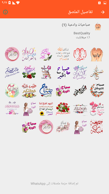 ويمكنك من خلال تطبيق ( ملصقات واتس اب عربية 2020 - WAStickerApps Arabic ) بان تقوم باضافة اي قسم يعجبك من الملصقات الى تطبيق الواتس اب وعند الاضافة تاتي بشكل فروي في قسم الملصقات في تطبيق الواتس اب .